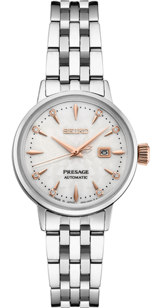 Seiko Presage Cocktail Time. Ofreciendo lo mejor de la relojería mecánica japonesa, la colección Presage combina tecnología de precisión con artesanía y diseño superior. Inspirada en la energía vibrante de los modernos salones de Tokio, la nueva línea Cocktail Time refleja la emoción de la ciudad con estilos y colores renovados. Con 8 diamantes que aportan un destello único a una carátula blanca con patrón estampado, acabado brillante y detalles en tono oro rosado, este exquisito reloj evoca el cóctel Clover Club. Elegante y refinado, su delicada caja alberga el nuevo y más delgado calibre automático mecánico 2R05 de 21 joyas, que late a una frecuencia de 21,600 vibraciones por hora, con una reserva de marcha de aproximadamente 41 horas y capacidad de cuerda manual. El brazalete cónico de cinco filas, con acabado espejo, añade un toque de brillo adicional. Fabricado en acero inoxidable, este distintivo reloj incluye un calendario, cristal abombado, fondo de caja transparente con cierre de rosca y un broche desplegable con botón de liberación. Resistente al agua hasta 5 bares, 50 metros.