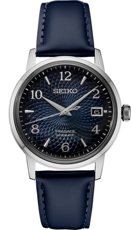 Seiko Presage Cocktail Time. Ofreciendo lo mejor de la relojería mecánica japonesa, la colección Presage combina tecnología de precisión con una artesanía y diseño superiores. Con un enfoque más lúdico de la popular línea inspirada en los cócteles, este encantador reloj forma parte de un grupo que refleja el encanto casual de un bar vacacional. Inspirado en el cóctel Old Clock, su carátula azul degradada presenta un patrón prensado que recuerda la luz reflejada por una copa clásica de cóctel, así como números que evocan las tipografías de etiquetas vintage de licor. El movimiento de 23 joyas, con carga manual y automática, late a una frecuencia de 21,600 vibraciones por hora y cuenta con una reserva de marcha de aproximadamente 41 horas. Fabricado en acero inoxidable, este distintivo reloj incluye calendario, cristal tipo box-shaped, fondo de caja transparente atornillado, correa de piel azul lisa y cierre desplegable tri-fold con pulsador. Resistente al agua 5 bares, 50 metros.