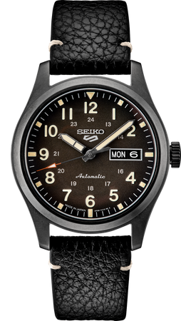 Seiko 5 Sports. Inspirado en el diseño de campo/militar clásico, este reloj de estilo retro ofrece líneas auténticas con la durabilidad necesaria para acompañarte todo el día. Impulsado por tecnología automática que se activa con cada movimiento, este versátil guardatiempo cuenta con un movimiento de 24 joyas que late a 21,600 vibraciones por hora, ofrece una reserva de marcha de aproximadamente 41 horas y permite cuerda manual. La carátula negra presenta números arábigos, calendario de día/fecha, aguja segundera con punta en rojo-naranja y manecillas e índices luminosos en beige. Fabricado en acero inoxidable con acabado en ion negro, este distintivo modelo incluye una correa de piel negra con costuras en contraste, además de un fondo de caja atornillado y transparente que permite apreciar la relojería clásica en acción. Resistente al agua 10 bares, 100 metros.