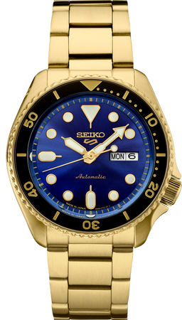 Seiko 5 Sports Creación Especial de EUA. Aportando un nuevo nivel de riqueza al diseño clásico deportivo/de vestir, este elegante reloj ofrece versatilidad para todo el día con un toque vanguardista. Impulsado por tecnología automática que cobra vida con cada movimiento, este dinámico guardatiempo alberga un movimiento de 24 joyas, que late a 21,600 vibraciones por hora, ofrece una reserva de marcha de aproximadamente 41 horas y admite cuerda manual. Enmarcado por un bisel unidireccional dorado para medir tiempos transcurridos, la carátula azul cuenta con manecillas e índices luminosos, además de un calendario de día/fecha. Fabricado en acero inoxidable con acabado dorado, este reloj excepcional incluye un broche desplegable triple con botón de liberación y seguro, así como un fondo de caja atornillado y transparente que permite apreciar la relojería clásica en acción. Resistente al agua 10 bares, 100 metros.