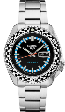 Seiko 5 Sports Edición Especial. Durante décadas, Seiko 5 Sports ha ofrecido niveles consistentemente altos de fiabilidad, durabilidad y rendimiento. Este dinámico reloj presenta un estilo actual con un toque vintage, con una caja actualizada y una carátula simplificada, pero manteniendo la clásica combinación de colores plateado y azul. Inspirado en los modelos vintage de Seiko 5 Sports de las décadas de 1960 y 1970, este reloj está rodeado por un bisel rotatorio unidireccional con un diseño a cuadros azul y blanco, mientras que la carátula negra con acabado radial incluye un calendario de día/fecha, una manecilla de segundero de color rojo-naranja y manecillas y marcadores luminosos. El diseño toma su esquema de colores y el patrón del bisel del "Checker Flag", uno de los diseños más populares de la época. Proporcionando tecnología automática que se activa con cada movimiento, el movimiento de 24 joyas, visible a través del fondo de caja transparente atornillado, late a una frecuencia de 21,600 vibraciones por hora, con una reserva de marcha de aproximadamente 41 horas y capacidad de cuerda manual. Caja de acero inoxidable con cierre desplegable de botón de presión y bloqueo. Resistente al agua hasta 10 bares, 100 metros.