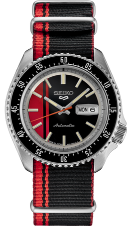 Seiko 5 Sports Creación Especial para EUA. Con colores vibrantes y un diseño audaz inspirado en las franjas de los autos de carreras vintage, este dinámico reloj combina un estilo memorable con durabilidad. Para un impacto adicional, las franjas negras y rojas fluyen desde la carátula hacia la correa de nailon coordinada, diseñada para ajustarse fácilmente sobre un uniforme de carreras. Enmarcada por un bisel negro unidireccional para medir tiempos transcurridos, la carátula también incluye un calendario de día/fecha, aguja segundera roja y manecillas e índices luminosos. Impulsado por tecnología automática que se activa con cada movimiento, este reloj inolvidable cuenta con un movimiento de 24 joyas que late a 21,600 vibraciones por hora, ofrece una reserva de marcha de aproximadamente 41 horas y permite cuerda manual. La caja, fabricada en acero inoxidable, incluye un fondo de caja transparente con cierre de rosca que permite observar la relojería clásica en acción. Resistente al agua 10 bares, 100 metros.