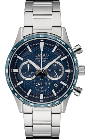 De la colección Essentials. Diseñado para evocar la emoción de conducir de noche, este elegante cronógrafo ofrece un perfil delgado ideal para un estilo deportivo o uso diario. Enmarcado por un bisel taquimétrico azul, su carátula azul intenso con acentos plateados aporta un toque urbano con su patrón prensado inspirado en la suela de un calzado en forma de “Y”. Con tres subcarátulas, incluyendo indicador de 24 horas y calendario de fecha, la carátula también cuenta con manecillas e índices LumiBrite. La función de cronógrafo mide hasta 60 minutos de tiempo transcurrido en incrementos de 1/5 de segundo. Fabricado en acero inoxidable, incorpora cristal de zafiro resistente a rayones y cierre desplegable tri-fold con pulsador. Resistente al agua 10 bares, 100 metros.
