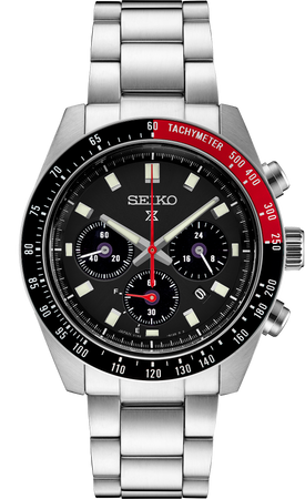 Cronógrafo Solar Prospex Speedtimer. Diseñado para quienes tratan la vida como la máxima aventura, Seiko Prospex sigue avanzando, superando cada desafío con excelencia tecnológica y un diseño ganador. Este reloj resistente y elegante forma parte de una colección de alta intensidad inspirada en el “Speedtimer” de 1969, el primer cronógrafo automático del mundo. Rindiendo homenaje al icónico original con su bisel taquimétrico de aluminio en dos tonos, negro y rojo, e índices de segundos colocados en el anillo de la esfera para una esfera más limpia y clara, este reloj excepcional ofrece un mayor énfasis en la usabilidad, legibilidad y visibilidad al agregar manecillas e índices LumiBrite, un tamaño de caja ligeramente más grande y un brazalete cónico de tres eslabones. La función de cronógrafo mide hasta 60 minutos de tiempo transcurrido en incrementos de 1/5 de segundo e incluye una función de tiempo dividido, mientras que la célula solar, alimentada por cualquier fuente luminosa, sin necesidad de cambio de batería, proporciona una reserva de marcha de 6 meses cuando está completamente cargada. La carátula negra, con un acabado brillante con efecto rayos de sol, cuenta con tres subcarátulas negras, con indicador de 24 horas e indicador de reserva de marcha, así como un calendario de fecha y una manecilla de cronógrafo roja. Elaborado en acero inoxidable, con un cristal de zafiro antirreflectante curvado, fondo de caja atornillado de forma segura y cierre de botón de apertura triple. Resistente al agua hasta 10 bares, 100 metros.