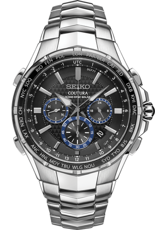 Coutura Radio Sync Solar Chronograph. Este atrevido reloj para hombre está diseñado con una caja y un brazalete de acero inoxidable y una corona de cabujón. La atrevida carátula negra presenta manecillas e índices LumiBrite, un calendario de fecha y tres subcarátulas con reflejos azules. El bisel gris incluye una función de hora mundial con 25 zonas horarias. El cronógrafo solar Radio Sync, controlado por radio, recibe automáticamente señales de radio para ajustar con precisión la recepción de la señal de hora y calendario y el indicador de resultados. El cronógrafo mide hasta 60 minutos en incrementos de 1/5 de segundo con una función de medición de tiempo fraccionado y un calendario de fecha. Alimentada por cualquier fuente luminosa, su célula solar es energéticamente eficiente con una reserva de energía de 6 meses una vez completamente cargada. No es necesario cambiar la batería. Resistente al agua hasta 100 metros.