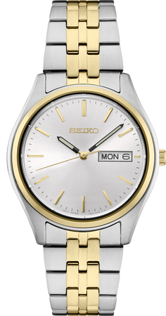 De la Colección Essentials. Ofreciendo diseños clásicos de vestir y deportivos, la Colección Essentials es la solución ideal para el uso diario. Fabricado en acero inoxidable con un versátil acabado bicolor, este reloj perfectamente equilibrado presenta una carátula blanca con efecto rayos de sol, calendario de día/fecha e índices dorados estilizados, logrando una combinación excepcional de claridad y estilo. Resistente al agua 10 bares, 100 metros.