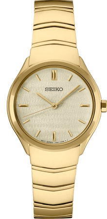 De la Colección Essentials. Con una sofisticación elegante, este reloj distintivamente moderno hace una declaración de estilo inmediata. La carátula limpia y minimalista, en color champán claro con índices de barra simples, presenta una sutil textura metálica que aporta un interés visual adicional, mientras que las suaves curvas del brazalete se destacan por un acabado de espejo y líneas finas. Fabricado en acero inoxidable con un rico acabado dorado, este memorable guardatiempo incluye un broche desplegable triple con botón de liberación. Resistente al agua 5 bares, 50 metros.