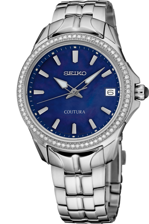 De la Colección Coutura. Expresando una sofisticación moderna y refinada, la Colección Coutura combina ángulos audaces y un diseño elegante con un cronometraje superior para un estilo deportivo y de vestir sin esfuerzo. Este versátil guardatiempo, perfecto para un estilo de día a noche, cuenta con un bisel de diamantes que aporta un toque de lujo y una carátula de madreperla azul oscuro brillante con índices aplicados en plateado, que añaden una rica apariencia tridimensional al diseño elegante. Fabricado en acero inoxidable, con 72 diamantes adornando el bisel y una caja y brazalete perfectamente proporcionados para un ajuste estilizado, este refinado reloj incluye un cristal de zafiro resistente a los rayones, manecillas e índices LumiBrite, calendario de fecha, clásica corona con cabujón y un broche desplegable triple con botón de liberación. Resistente al agua 10 bares, 100 metros.