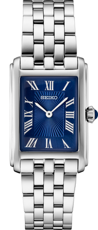 De la Colección Essentials. Un clásico sofisticado, perfectamente proporcionado para ofrecer una sensación similar a la de una joya, este elegante reloj de caja rectangular presenta una carátula azul con patrón, números romanos, manecillas e índices plateados, y una corona con cabujón azul. Fabricado en acero inoxidable, este refinado diseño incluye un brazalete de cinco filas en acero inoxidable para una comodidad impecable, con broche desplegable triple y botón de liberación. Resistente al agua 5 bares, 50 metros.