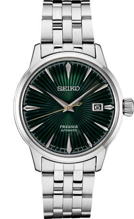 From the Presage Cocktail Time Collection. Offering the finest in Japanese mechanical watchmaking, the Presage Collection blends precision technology with superior craftsmanship and design. Inspired by the delights of a cocktail bar, this sophisticated watch features a green dial with pressed pattern, gloss finish and date calendar. The 23-jewel movement, with manual and automatic winding capability, beats at a frequency of 21,600 vibrations per hour, with a power reserve of approximately 41 hours. Crafted of stainless steel, this elegant timepiece includes a box-shaped crystal, screwdown see-through caseback, and double deployment clasp with push button release. 5 bar, 50M Water Resistant