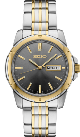 From the Essentials Collection. Offering classic dress/sport designs, the Essentials Collection provides the ideal solution for both everyday wear and dress occasions. Crafted of stainless steel, with two-tone polished and brushed finishes, this perfectly tailored design features a gray sunray dial with gold accents, day/date calendar, and LumiBrite hands and markers. 10 bar, 100M Water Resistant